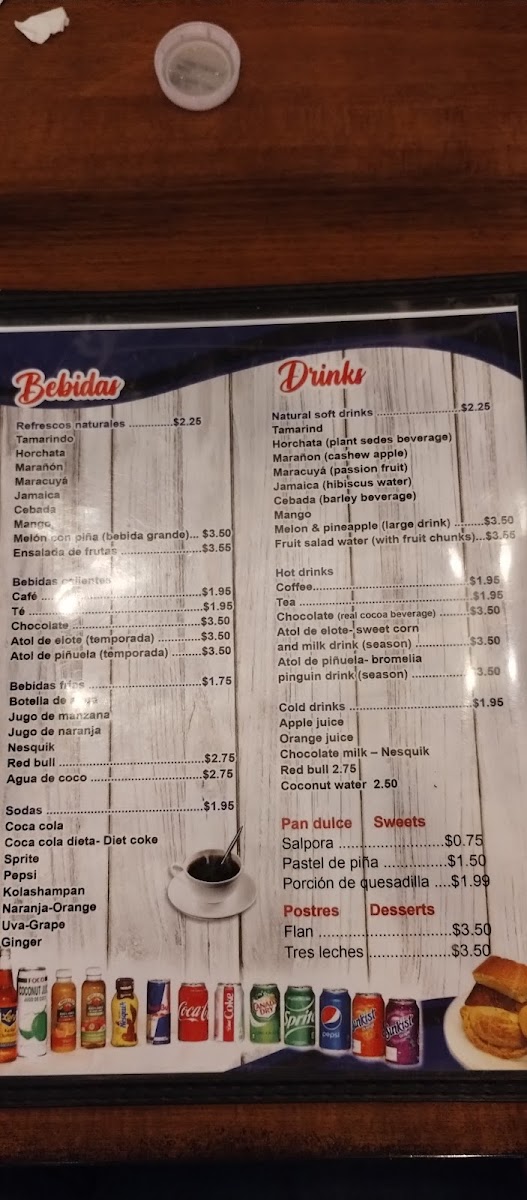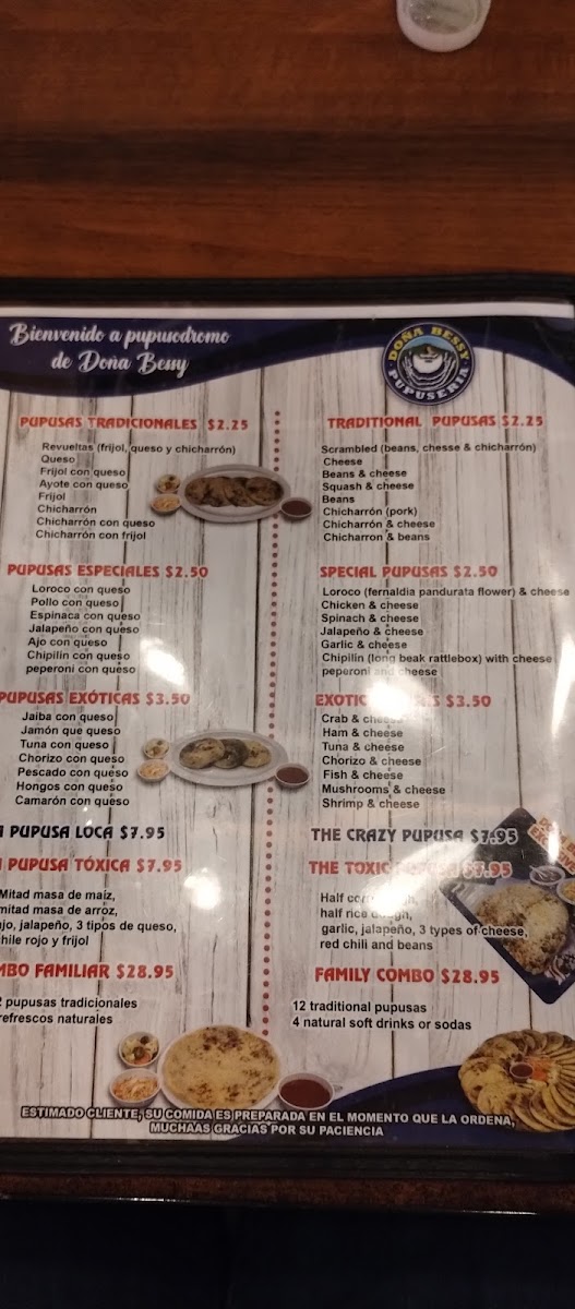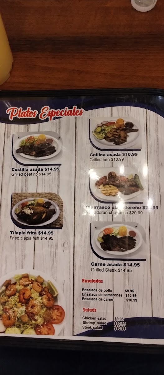 Pupuseria Doña Bessy offers a delightful selection of traditional Salvadoran and Latin American dishes. The Ensalada De Pollo (Chicken Salad), Ensalada De Camarones (Shrimp Salad), and Ensalada De Carne (Steak Salad) provide a fresh, vibrant start to any meal. For beverages, guests can enjoy refreshing drinks such as Tamarindo, Horchata, Maracuyá, and Jamaica, offering a variety of sweet and tangy flavors. Sweets like Salpora, Pastel De Piña (Pineapple Cake), and a Porción De Quesadilla provide a satisfying end to the meal. The restaurant’s Platos Especiales (Special Plates) feature flavorful options like Pechuga Asada (Grilled Chicken Breast), Carne Encebollada (Steak with Onions), and Camarones En Crema (Shrimp in Cream), offering rich and hearty tastes. For those craving something lighter, the Chicken Bread, Choripán (Grilled Sausage Sandwich), and Yaya sandwich are excellent choices. The Costilla Asada (Grilled Ribs), Gallina Asada (Grilled Chicken), Tilapia Frita (Fried Tilapia), and Churrasco Salvadoreño (Salvadoran Grilled Steak) round out the menu, providing a delicious array of grilled meats and seafood. With an extensive variety of options, Pupuseria Doña Bessy has something for every palate.